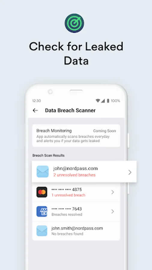 With the NordPass Data Breach Scanner, check whether your passwords or credit card details have ever been leaked, and enable Breach Monitoring to get real-time alerts in case this sensitive information appears in a breach.