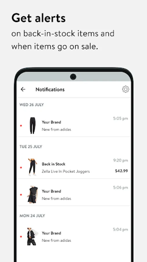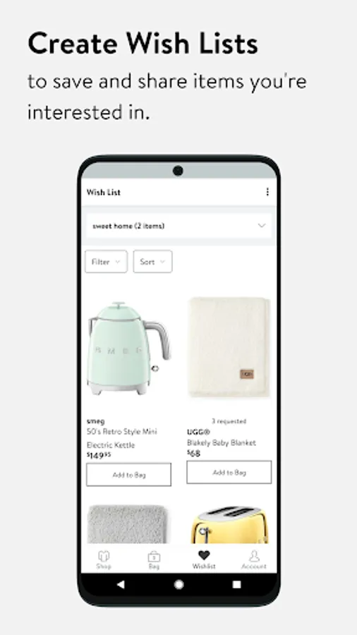 • Alerts when your favorite items come back in stock or go on sale in your Wish List or Bag