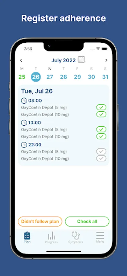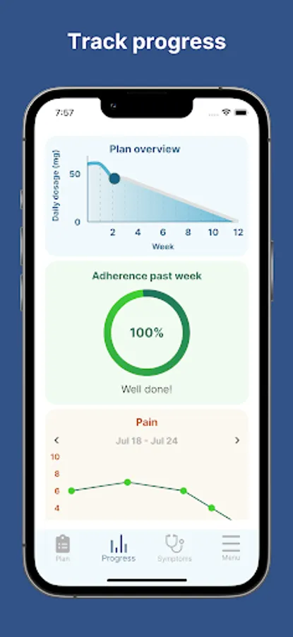 The Tapering Plan. Here the patient can see today’s doses of the medication, as well as the structure of the plan for the next days and weeks. The patient can confirm their adherence to the plan.