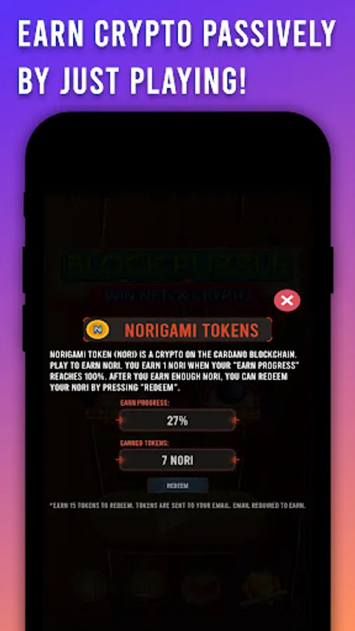 To earn, just play the game as intended and after meeting a threshold, you will be awarded a NORI token. Once you meet minimum to redeem the tokens, hit the "Redeem" button and the tokens will be sent to your email.