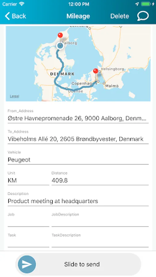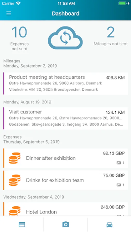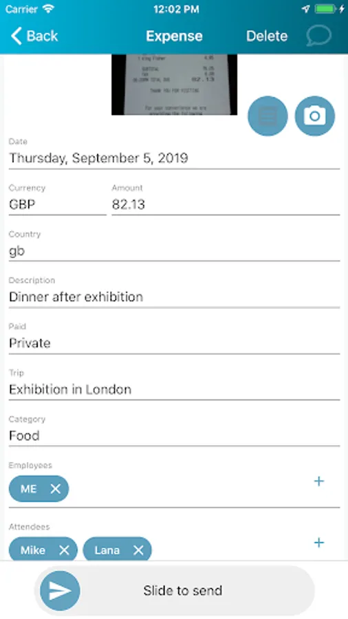 Report expenses and mileage in the app by snapping the receipt and/or enter the mileage directly.