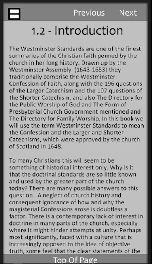 The aim of this modern English revision, released in book form in 2017 and digitally on the play store in 2019, was simply to preserve the original integrity of these documents and their proof-texts through the light editorial changes to remove the seventeenth and eighteenth-century English and to insert the common English used today. No doctrinal changes have been introduced. The numbers of people involved in proofreading, editing, formatting and encouragement in this project are more than it is possible to list.