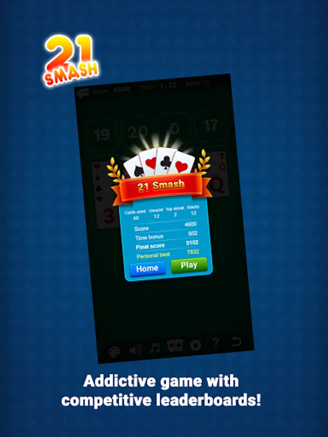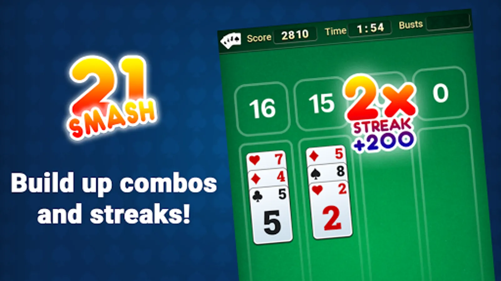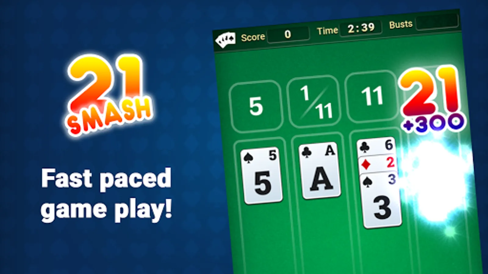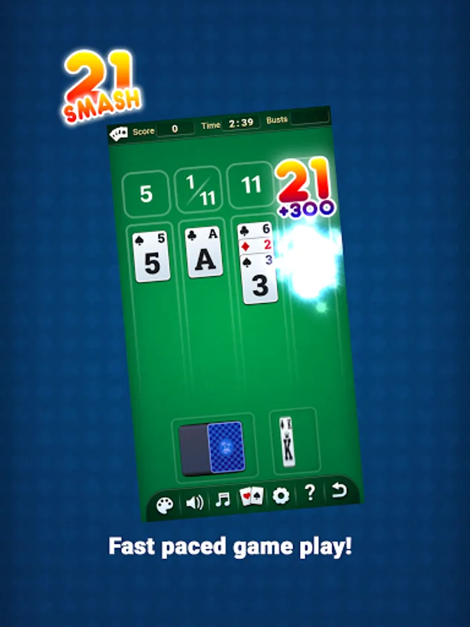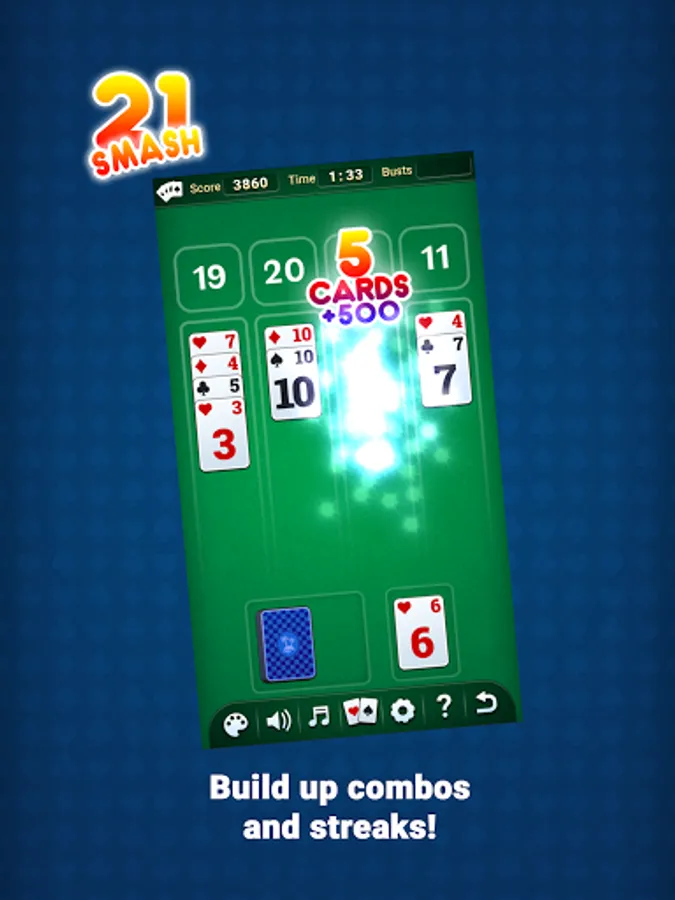 Try to get 21s, or stack up five cards to SMASH'em away! Make as many combos as you can and try to finish as fast as you can! Fight against the clock!