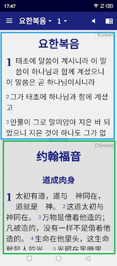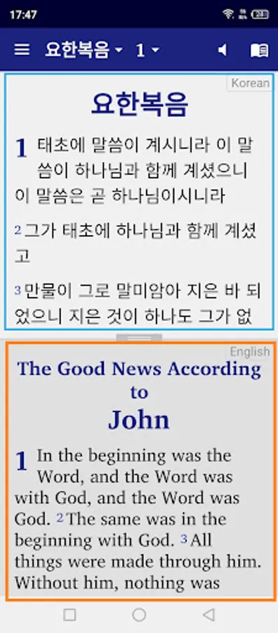 - "구절별"은 한국어 구절을 표시한 후 같은 구절을 영어 또는 선택한 다른 버전 중 하나로 표시합니다.