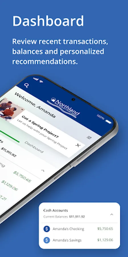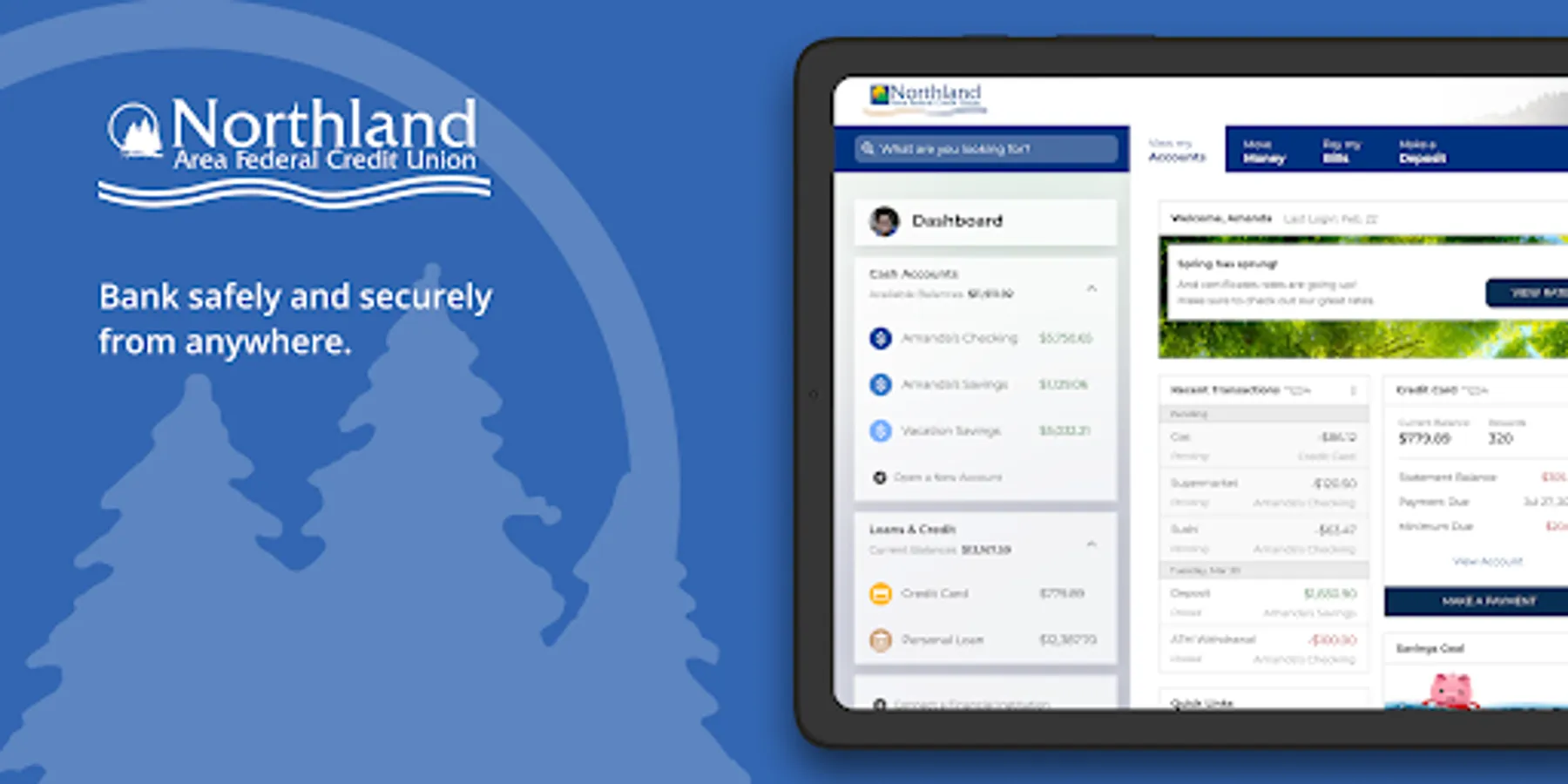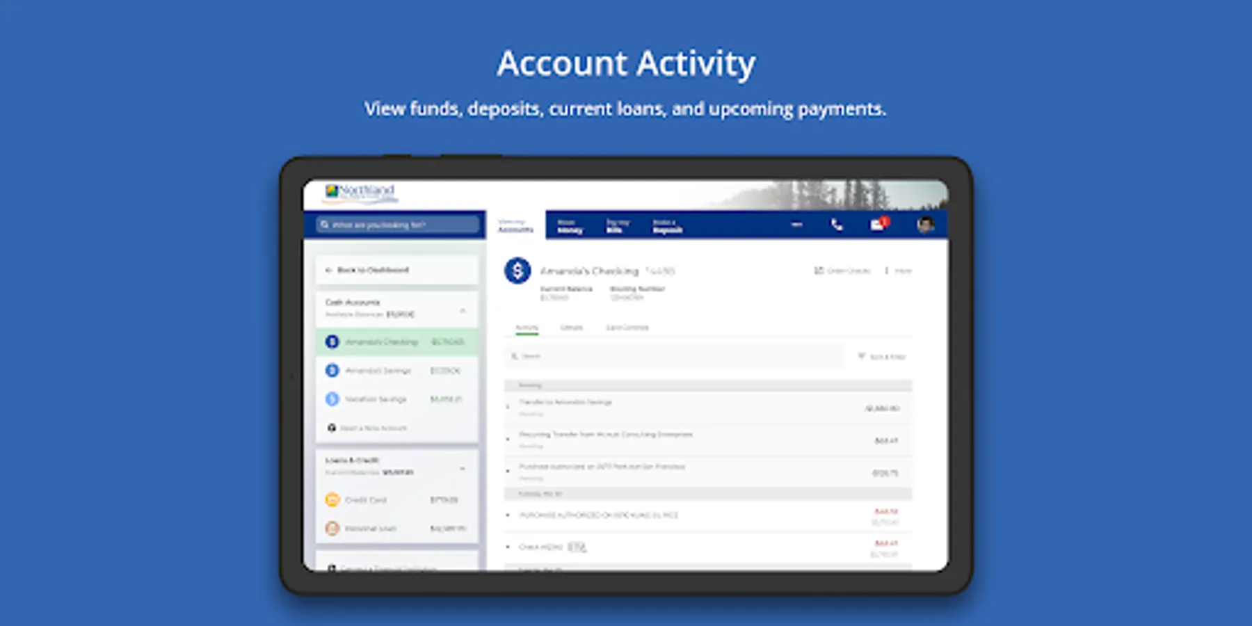 Dashboard - Manage all of your Northland accounts in one easy to view dashboard. View available funds, the progress of savings goals, upcoming payments, how much you’ve deposited, and personal recommendations all in one simple and easy to read screen.