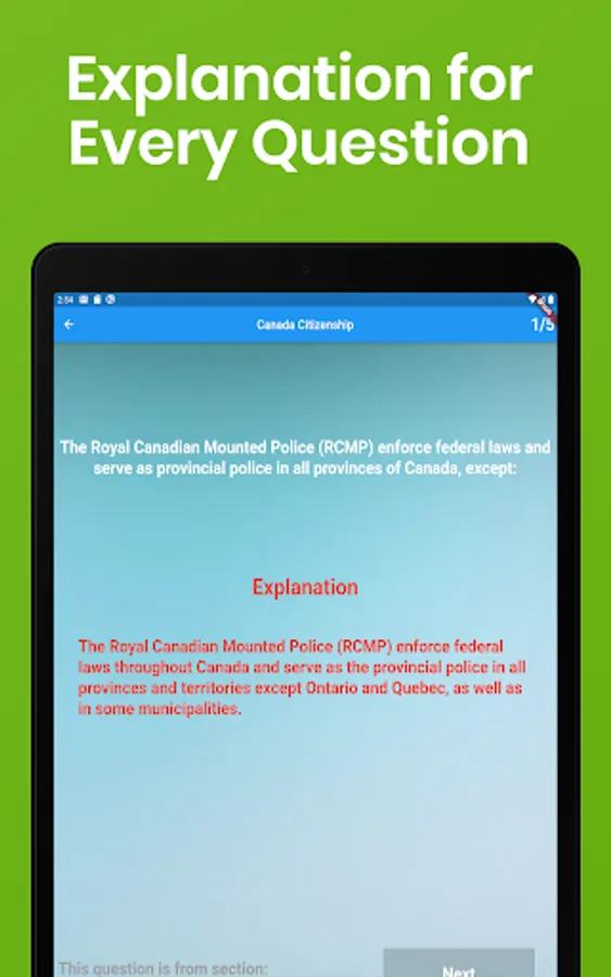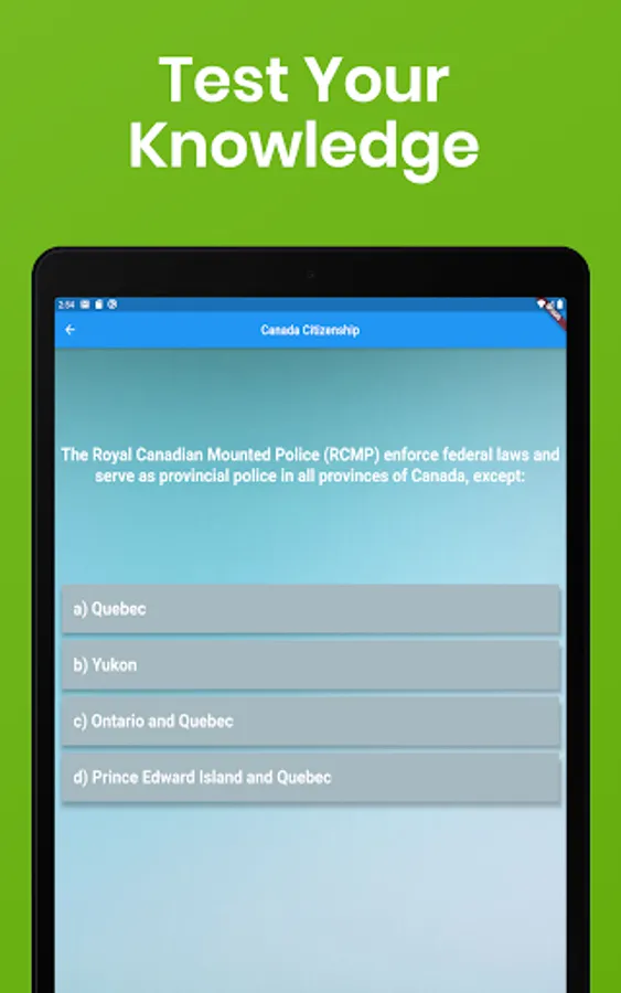 Do you want to become a Canadian? If so, you must pass the mandatory Canadian Citizenship test. Based on statistics, up to 30% of applicants fail this challenging test each year. This app is professionally designed to help you effectively study and pass the Citizenship Test. With more than 200 actual questions based on the official study guide "Discover Canada", you will learn about Canada's history and geography, economy, symbols, the justice system, governing system, and the rights and responsibilities of being a Canadian right here on your Android phone or tablet. This app even comes with questions unique to your province or territory to meet your individual needs!