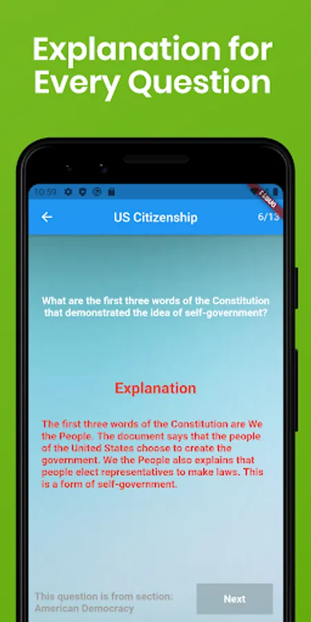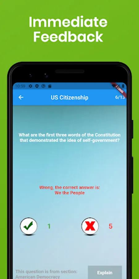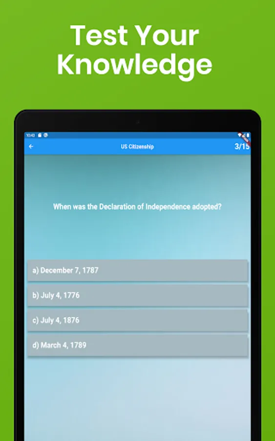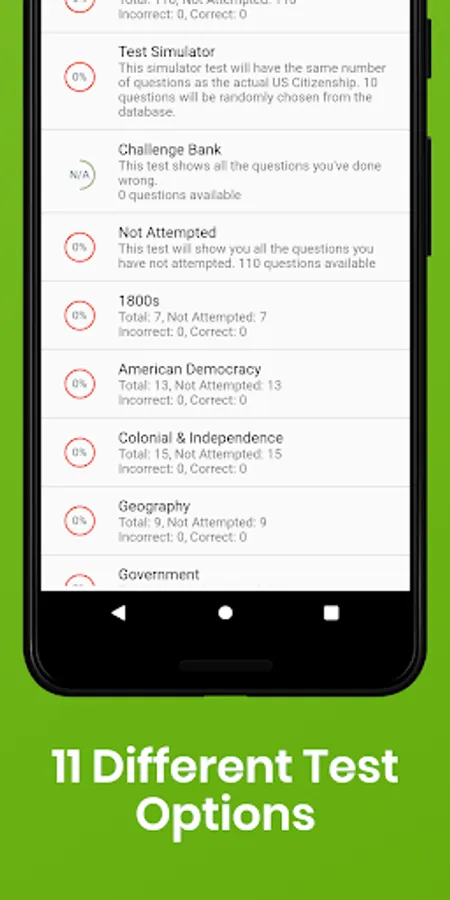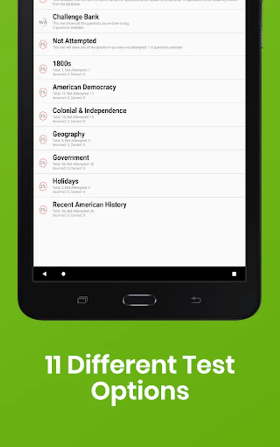 • Option to review all the US Citizenship Naturalization Test questions if you don't want to take the quiz
