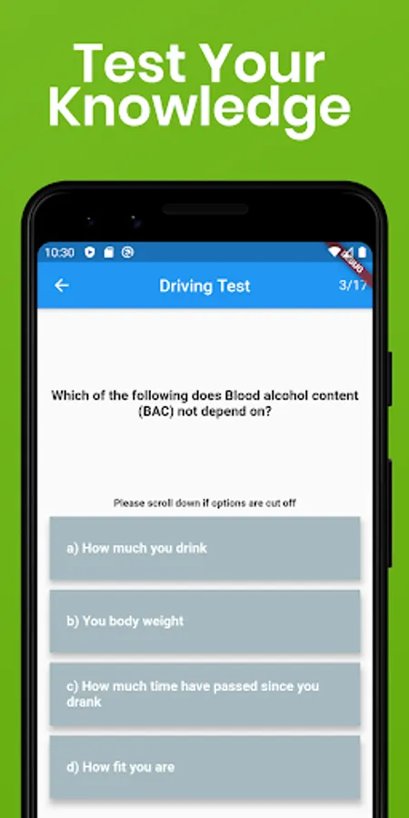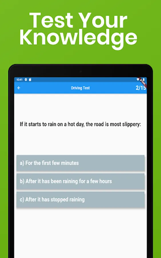 Do you want to spend only a few hours studying and still pass your DMV Permit Driving Test on the first try? This app is professionally designed specifically for the DMV written exam. All the practice questions are based on the latest official Driver's handbook. Don't waste time and money writing the DMV Test again and again. Study for your DMV Test right now on your phone or tablet!
