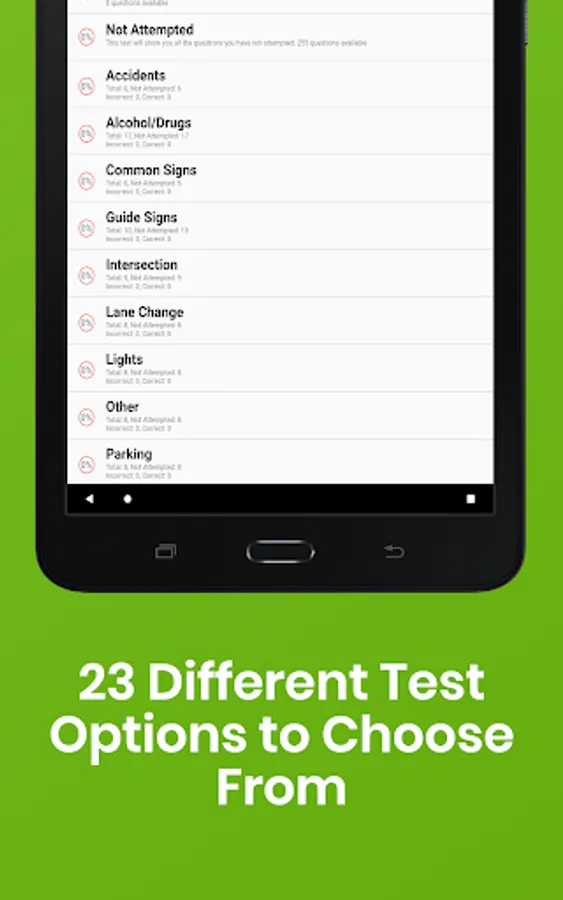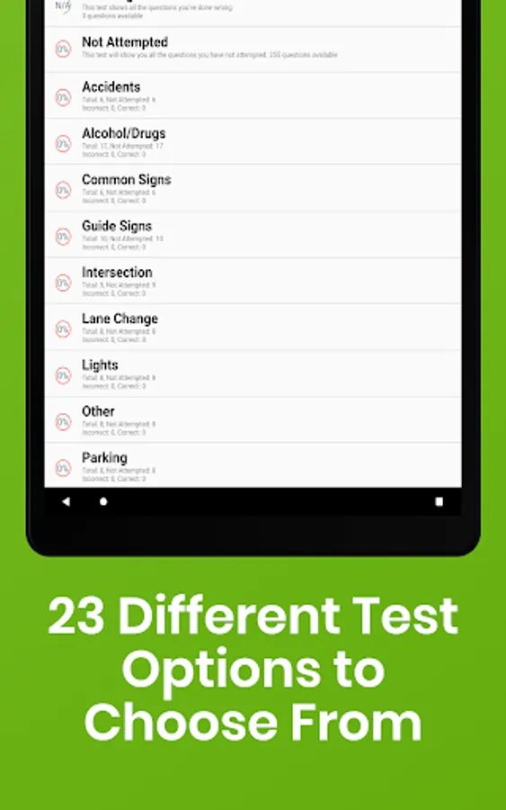 • The questions are divided into 19 different topics, including Alcohol and Drugs, Common Signs, Lane Changes, etc