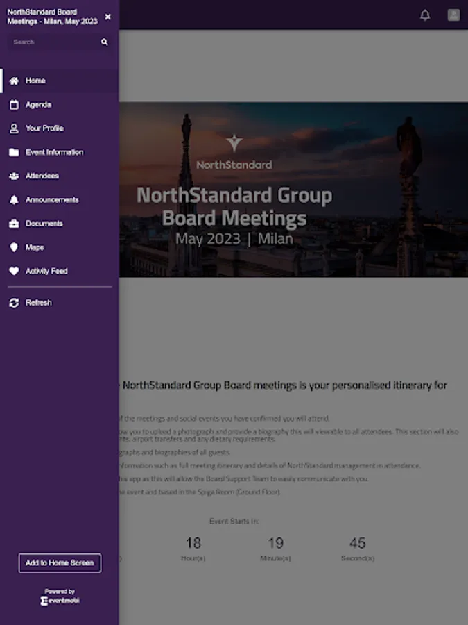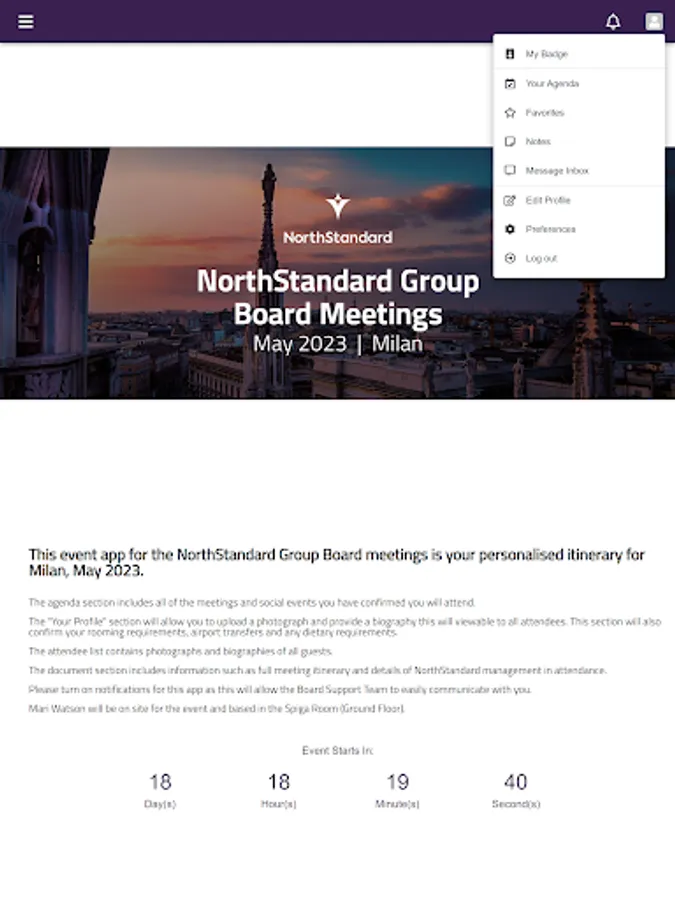 This event app for the NorthStandard Group Board meetings is your personalised itinerary for Milan, May 2023. The agenda section includes all of the meetings and social events you have confirmed you will attend. The "Your Profile" section will allow you to upload a photograph and provide a biography this will viewable to all attendees. This section will also confirm your rooming requirements, airport transfers and any dietary requirements. The attendee list contains photographs and biographies of all guests. The Document section includes information such as full meeting itinerary and details of NorthStandard management in attendance. Please turn on notifications for this app as this will allow the Board Support Team to easily communicate with you. Mari Watson will be on site for the event and based in the Spiga Room (Ground Floor)