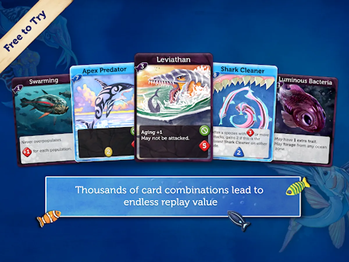 Based on the hit board game, Oceans offers a beautifully crafted strategy game experience. The reef and 20 deep cards are completely free to play (and ad-free!), and you may also join one multiplayer game per day free. A one-time upgrade to the Complete Game features 87 Deep Cards, 21 Scenarios, and multiple hard AI personalities for endless replay fun. You can now play online against others on any platform, in real time or asynchronously. Purchasing the Complete Game allows you to create your own decks for use in singleplayer and multiplayer, and create your own multiplayer games.