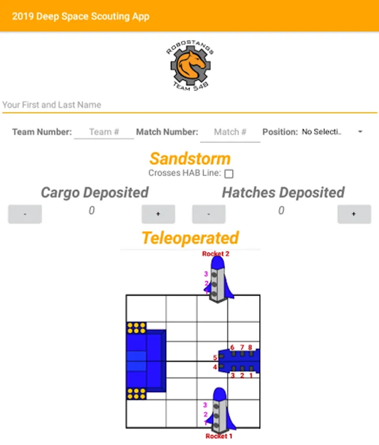 This is an app to collect scouting data during the 2019 Deep Space FRC competitions. The app is in compliance with all FRC Rules as it does NOT require any connection (Bluetooth, internet, data, etc) and is specifically optimized for use on any Android tablet. This app was developed by FRC Team 548, the Robostangs, who are based in Northville, Michigan.