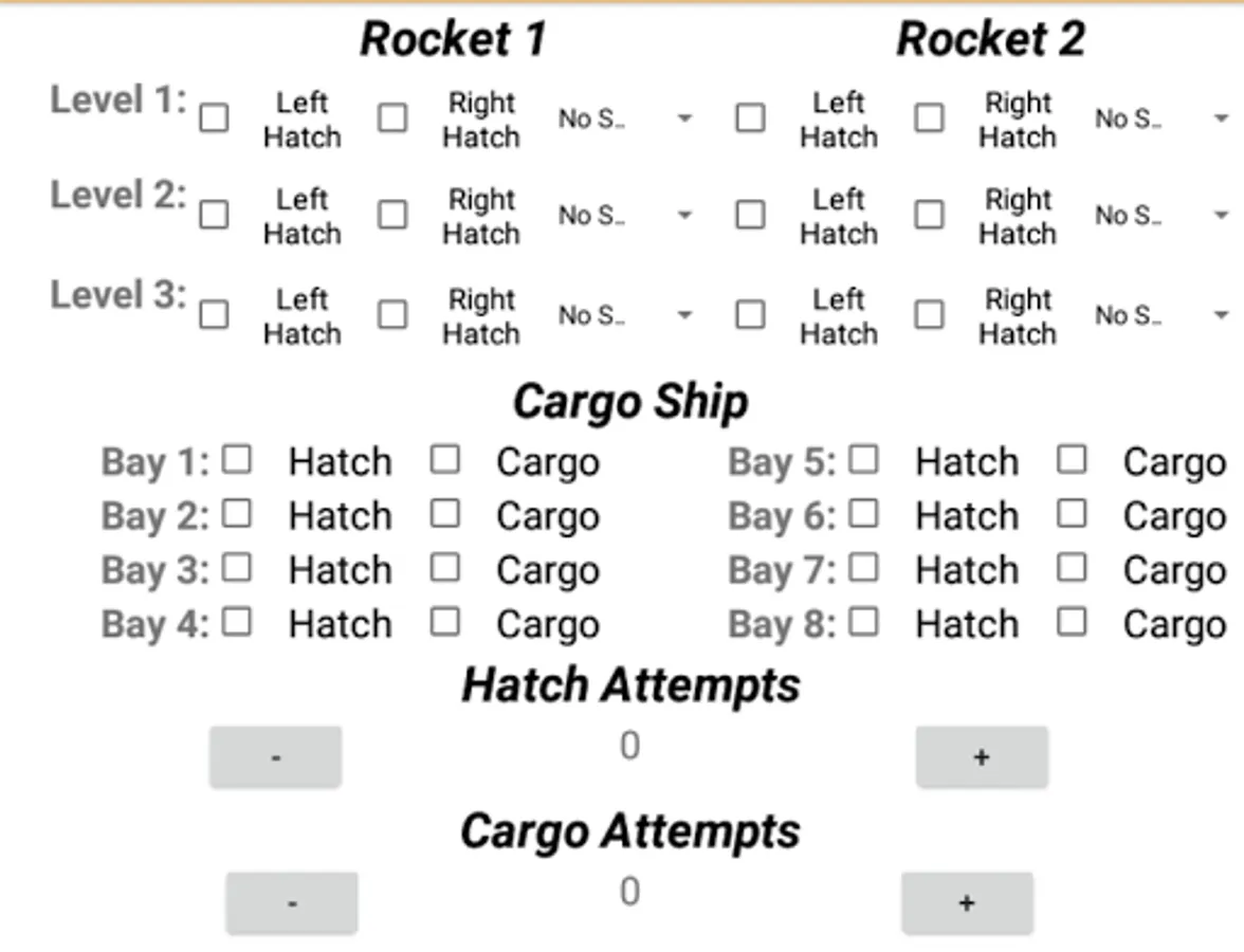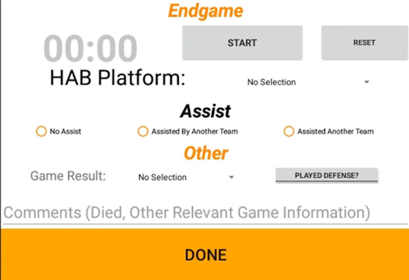 The app is organized to collect the data during the Sandstrom, Tele-Op, and Endgame. This application is designed to be part of a whole scouting system that works with seven total tablets used by the scouters, including one tablet to combine data from the 6 other tablets into one file for data analysis/dumping. Each tablet collects data for a single robot on the field and produces a QR Code on submission. The six individual QR codes may be scanned with the output being written into a text file. That text file may then be imported into tools such as Tableau or Excel for further data analysis.
