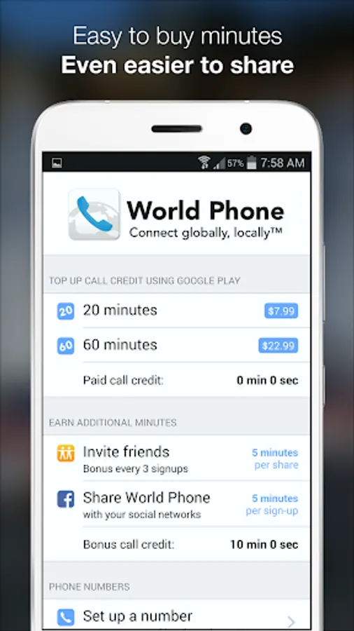 Effortlessly rent a new local or international number in World Phone with Virtual and World IDs. It's a second phone in your phone! Use these numbers for business, travel or family in foreign countries. Numbers are available in more than 70 countries.
