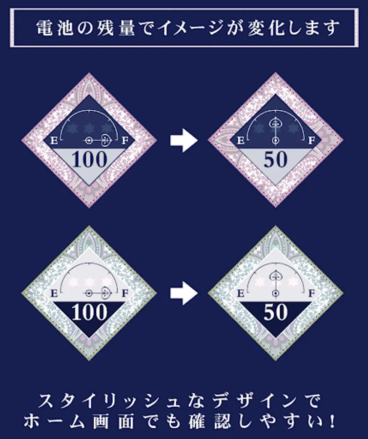 You can install the Earl NA (RNA) battery widget (Battery Widget) on standby. On the standby screen, let's paste it into like a stamp. 1 × 1,2 You can choose from the display size of × 2. In addition, meter and numbers in the bandanna of "Earl, NA (RNA)" will change by remaining battery power. Please be healed at a stylish "battery" widget to the home screen. Let's power savings easily by tapping the widget.