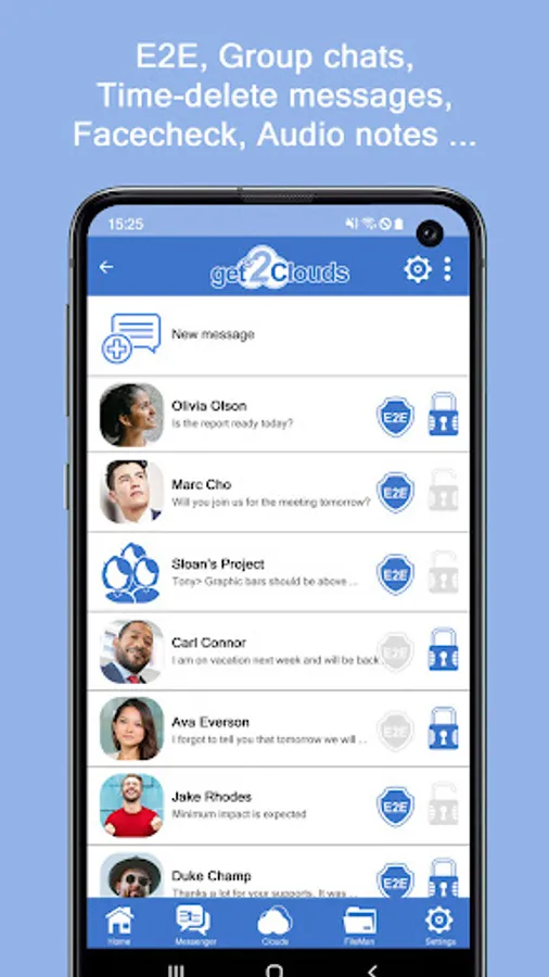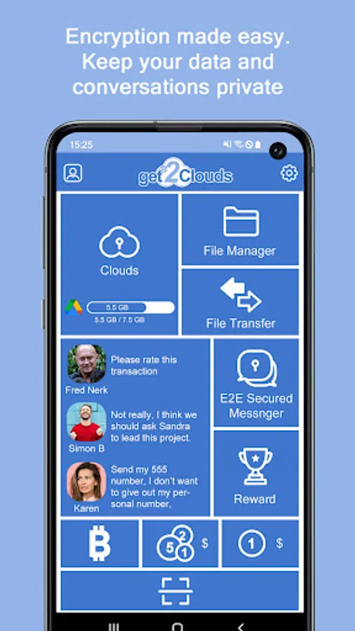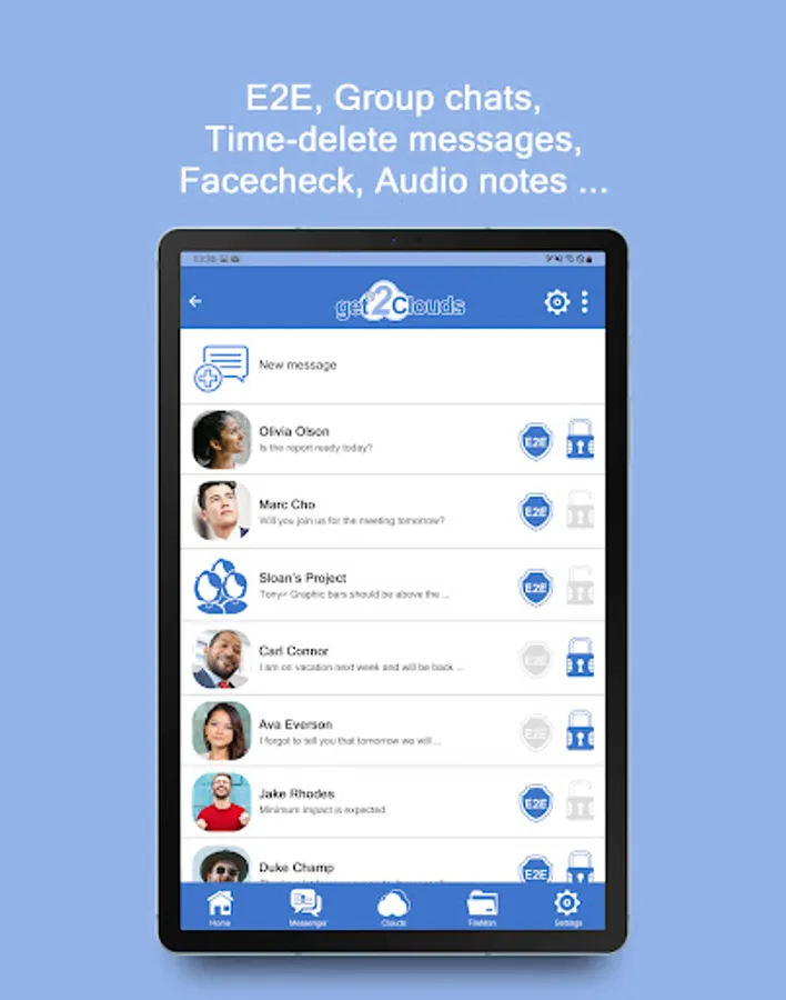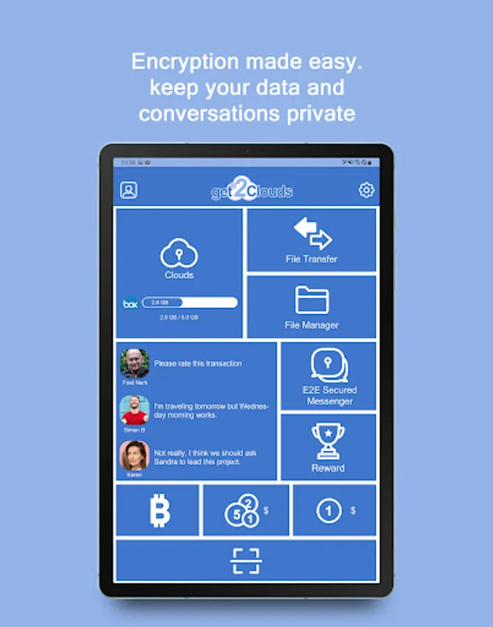 Anonymous ‘555’ number option for SIM-less devices and to protect personal phone number. Send messages, images, audio messages, videos, documents and large files to friends and colleagues securely, easily and quickly. get2Clouds uses a superior patented download manager that supports over one billion secure downloads annually for the industrial automation industry. With get2Clouds, data is encrypted before leaving your device. It passes through our secure servers in the form of unstructured binary junk. Only your intended receiver, also running get2Clouds, would be able to unencrypt it. We cannot access or view your data. This is no knowledge encryption.