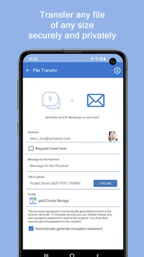 • Send large files free: Fast, encrypted file transfers of unlimited size on the go.