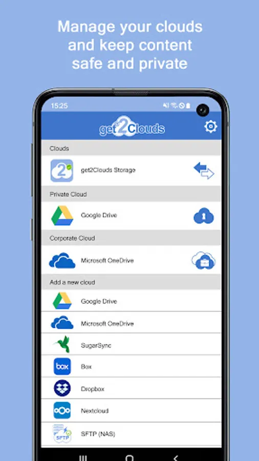 • Sync major cloud providers: Encrypt the data in your cloud. Compatible with Google Drive, Dropbox, Box, Microsoft OneDrive, Sugarsync.