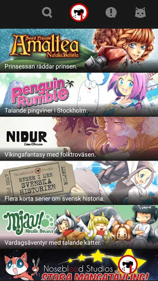 In Nosebleed Manga, a new manga is published in Swedish every week. It is Swedish-drawn manga and also international manga translated into Swedish. New free manga every month!