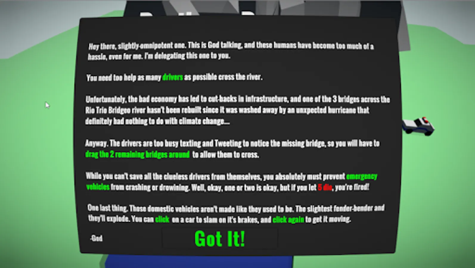 Perilous Passage gives you the omnipotent power to decide which lazy drivers live and die! Manipulate the bridges over the Rio Trio Bridgeo river to keep as many drivers alive as possible, without letting Police/Firefighters perish!