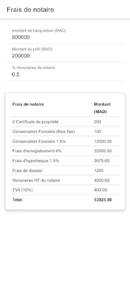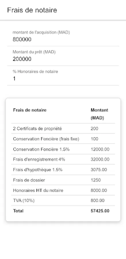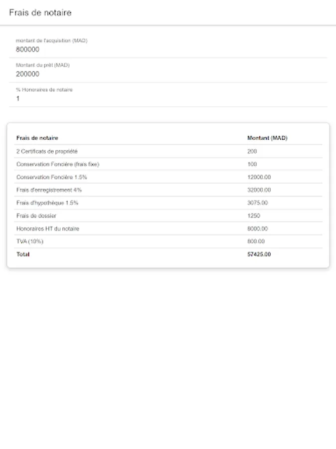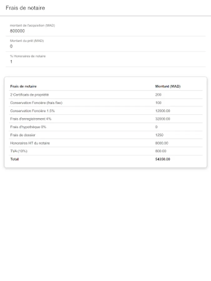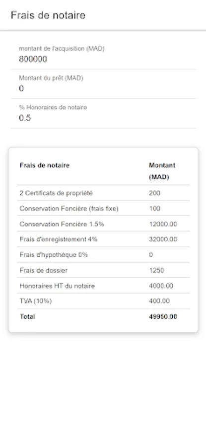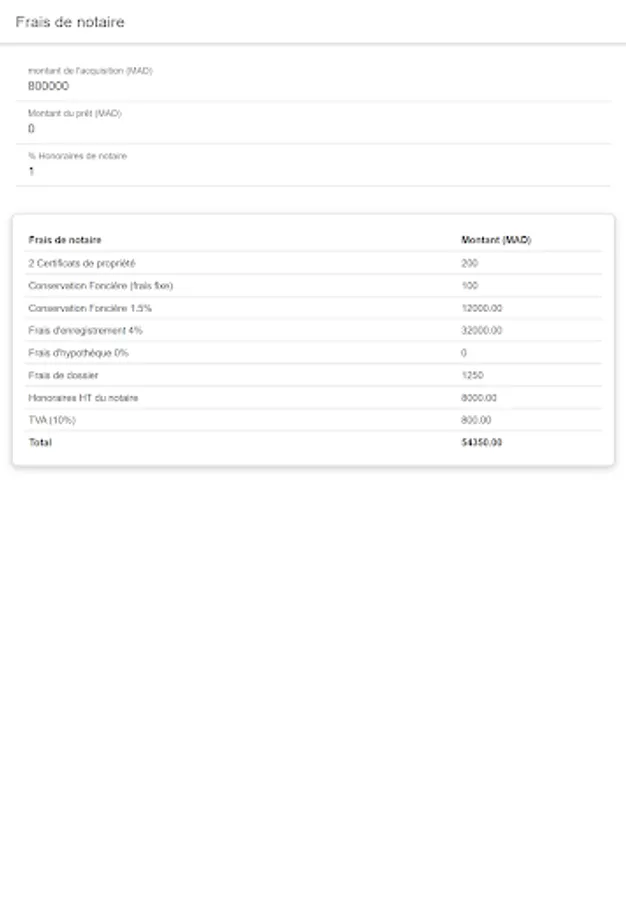 The application allows you to simulate notary fees by entering minimum information.