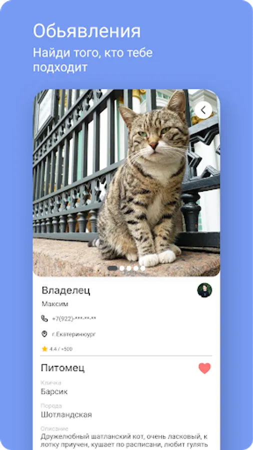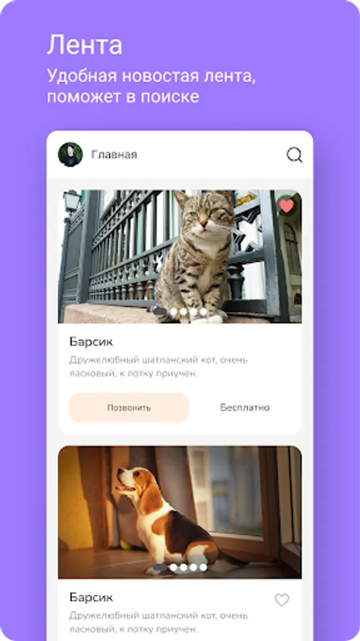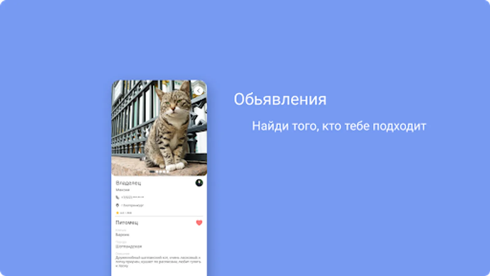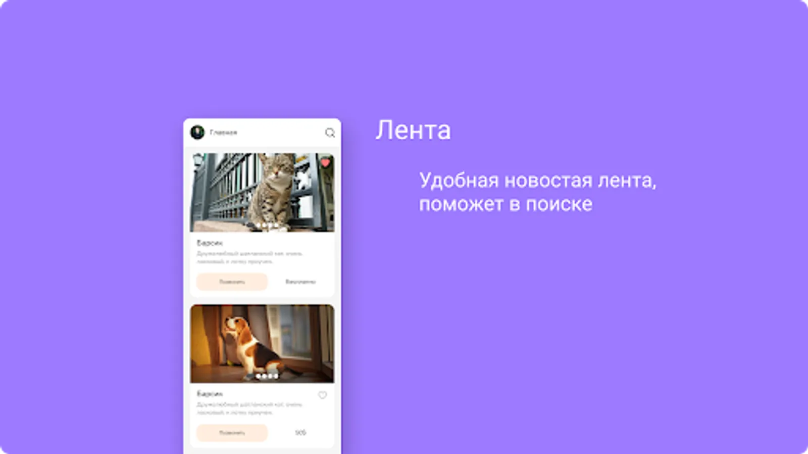 The application serves users to simplify their own search for a pet or find an owner for it. Thanks to the news feed, you can find out important information about the maintenance of pets, their relationship with them, individual characteristics and much more. The application has an announcement system that allows any user, for any reason, to find a new home for their pet or adopt a new pet that you like!