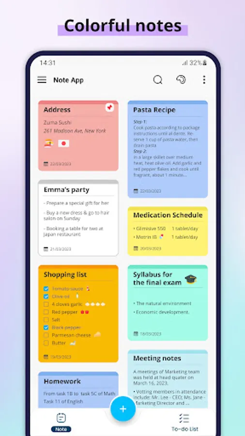 Create new notes with just a few taps, customize them with different fonts and colors, and organize them into folders or categories. The app's search function makes it easy to find specific notes by keywords or phrases. You can also set reminders for your to-do lists and notes, ensuring that you never miss an important task or deadline.