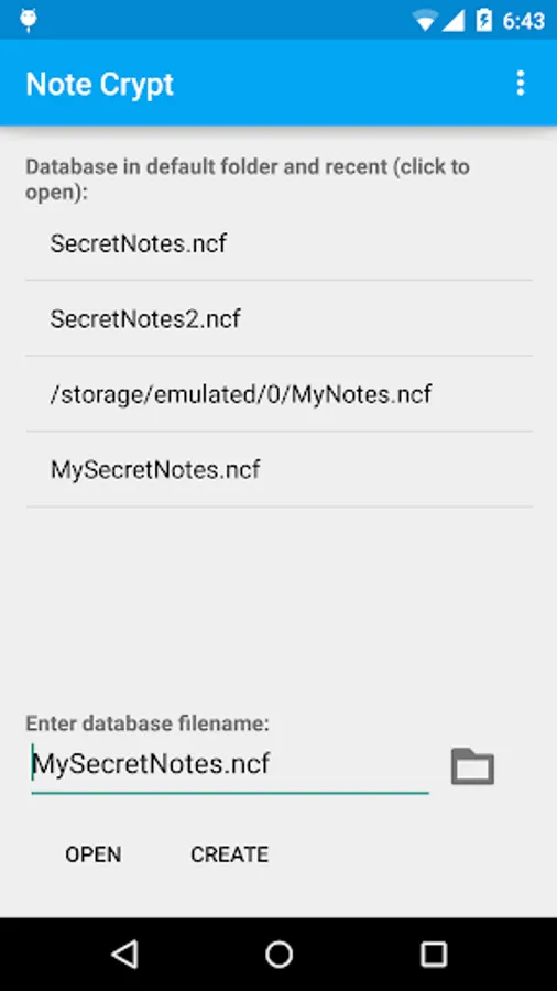 Now the default database location is the folder NoteCrypt on your external memory (eg. /storage/emulated/0/NoteCrypt)