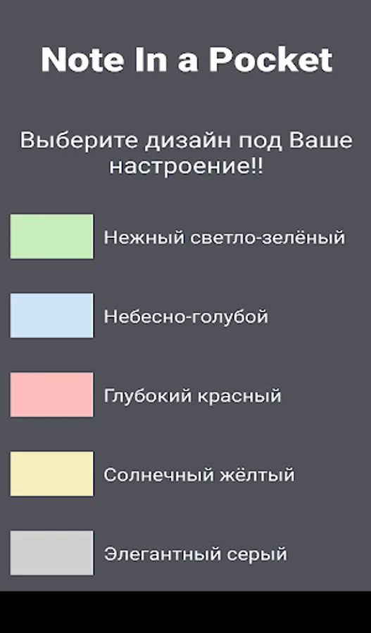 Элегантный и красочный блокнот позволит вам удобно делать заметки в Вашем смартфоне, а также выбирать дизайн под своё настроение