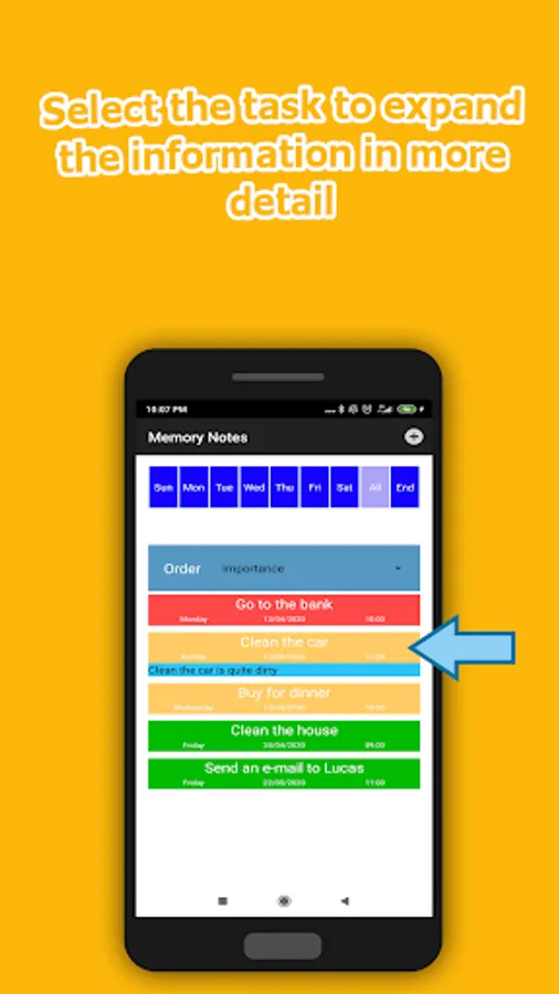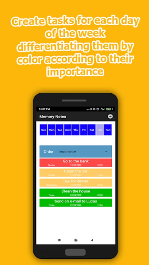 Differentiation of tasks by colors, according to the selected importance. The most important ones appear in red, the ones of lesser importance in yellow and the less urgent in green.
