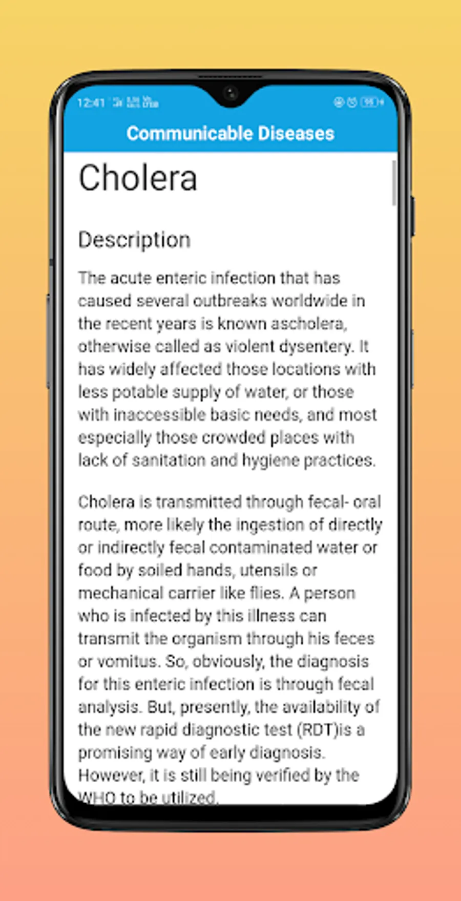 This Application contains a review on Communicable diseases, such as Cholera, Polio, Tuberculosis, Measles and many other more diseases that are caused by microorganisms such as bacteria, viruses, parasites and fungi that can be spread, directly or indirectly, from one person to another. Some are transmitted through bites from insects while others are caused by ingesting contaminated food or water.