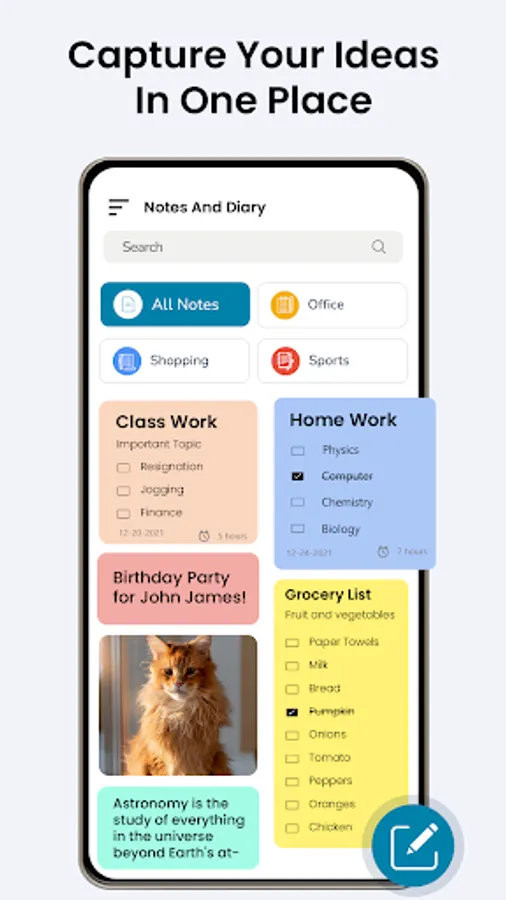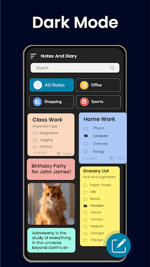 Notes Notepad is an easy-to-use notebook app for making notes, memos, or just any plain text content. User can make multiple notes and remind for different categories like home, office, education and trip that can be able to add more category very simple & easily. Notepad App provide you a quick document editing experience when the user get writing pad to do shopping list or many more.