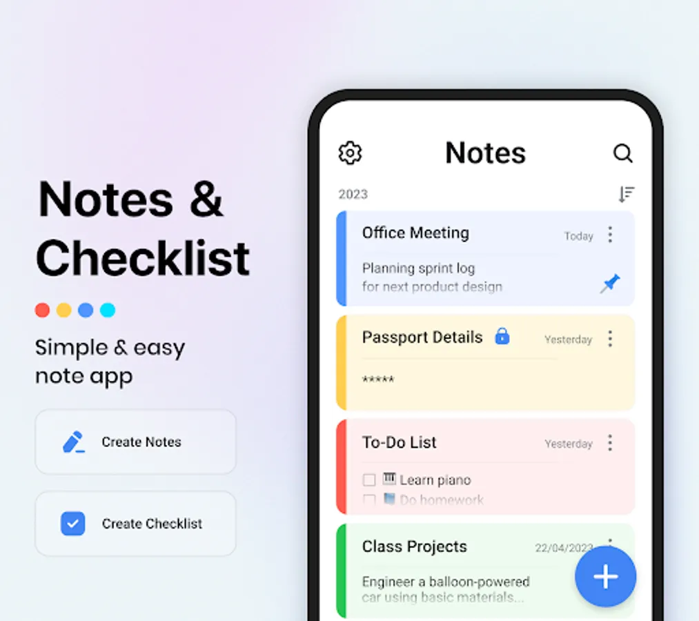 Notes is a simple and powerful app that lets you capture your thoughts, ideas, lists, and more. π Whether you need to jot down a quick reminder, create a shopping list, sketch a diagram, or write a journal entry, Notes has you covered. You can also attach photos, audio, web links, scanned documents, and other files to your notes. π With Notes, you can: