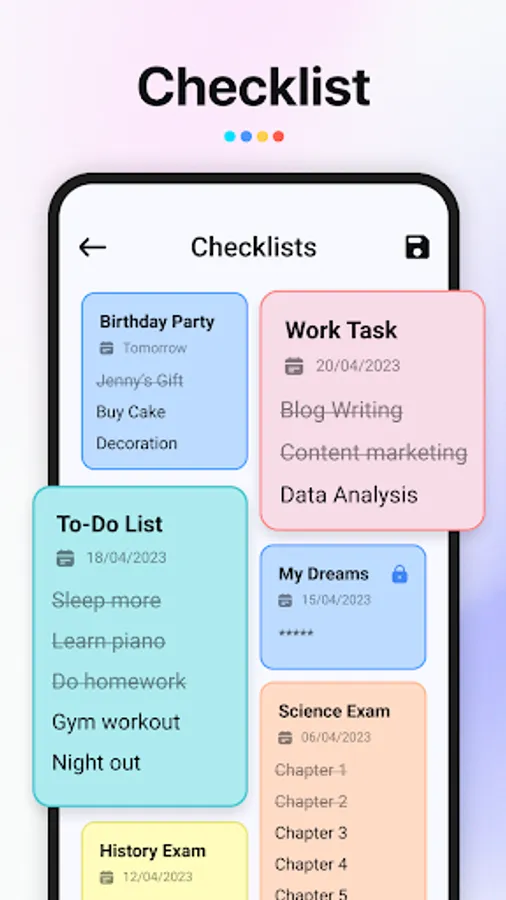 Create quick notes & checklists. Simplify your life by keeping all your important notes in one convenient digital notebook. Streamline your tasks and stay organized on the go!