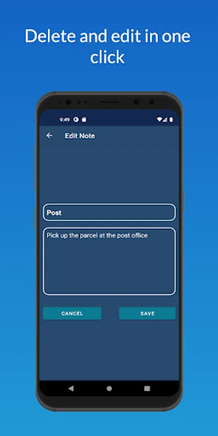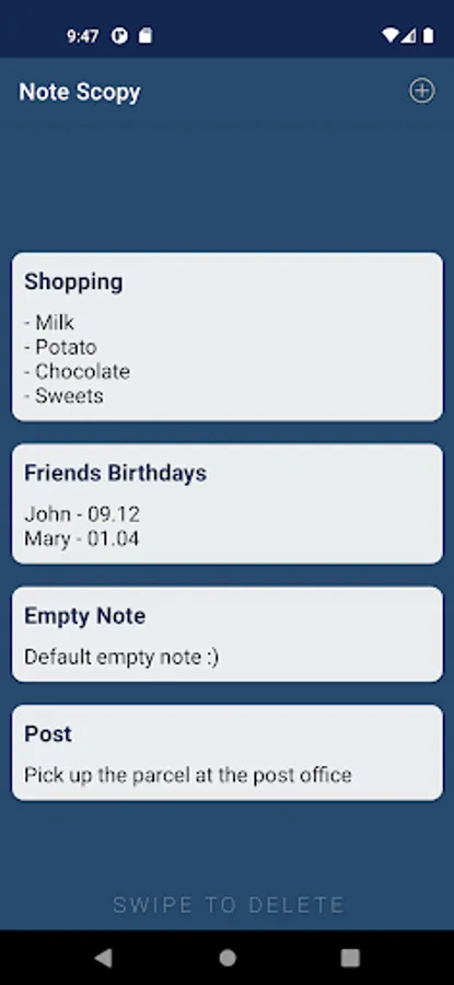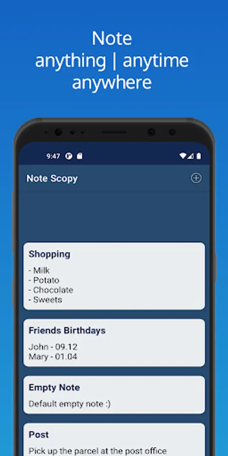 In the Note Scopy app, you can store an infinite number of your plans, to-dos and more. An intuitive interface will help you quickly record and save everything you need and just as quickly change or delete it.