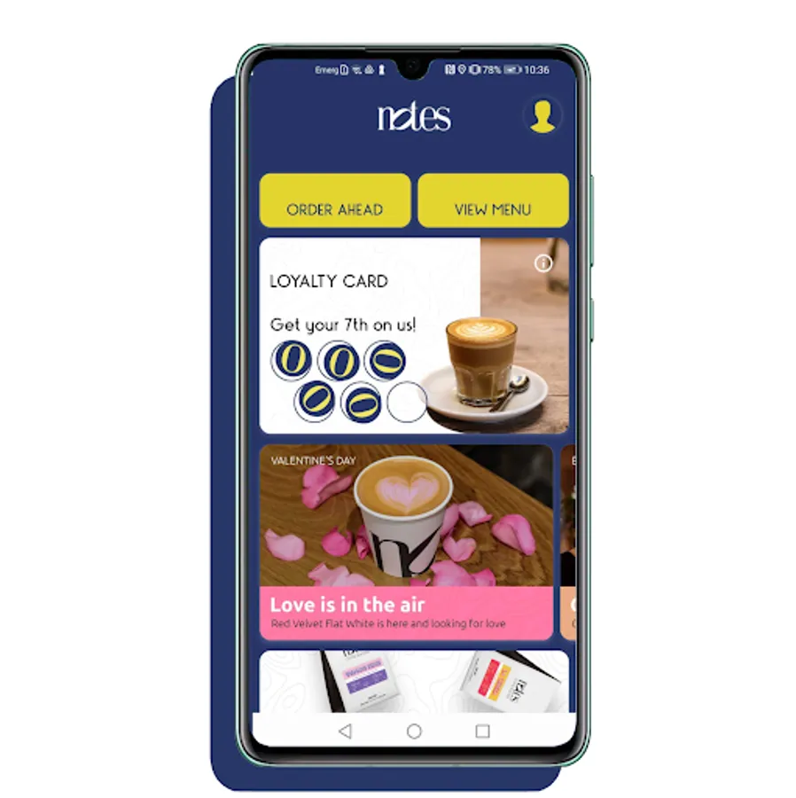 Our brand new App allows you to order ahead and collect a loyalty stamp for every coffee, when you have collected 6 stamps you can get a free coffee on us! The app allows you to enjoy a symphonic Notes experience while saving time and rewarding your loyalty. You can also keep up with everything Notes, including new deals, products, and special offers in our Web Store!