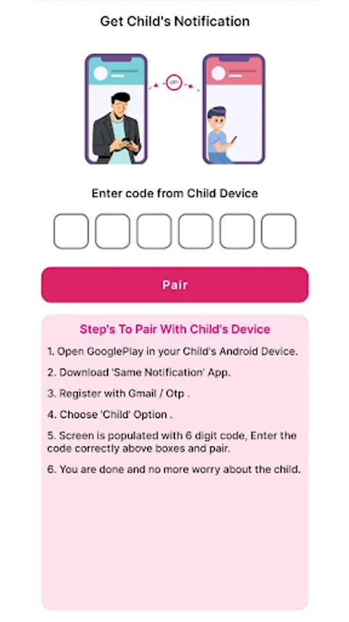 📱Pairing Code Entry: Enter the code shown on the child’s device into the parent’s device for instant pairing.