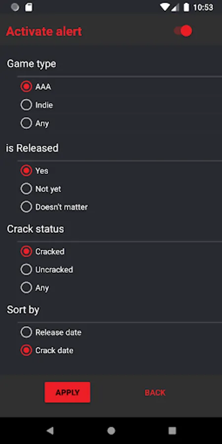 Unofficially the best app based on Crackwatch.com's APIs: search for your favorite PC games, put a crackwatcher on the crack status, watch un-cracked games, filter, set-up push notifications, discover new games, check the best deal and more!