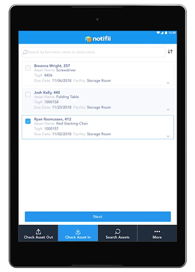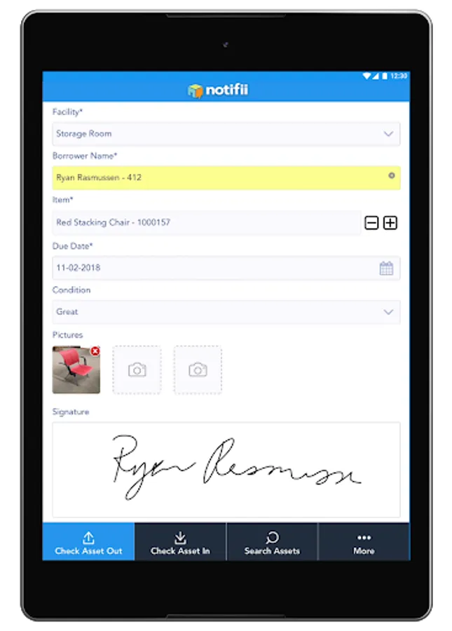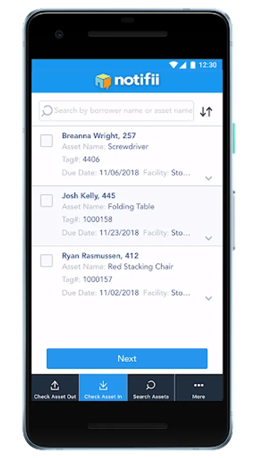 Notifii Checkout is an asset tracking system. Easily “check out” an item when someone borrows it. Easily “check in” an item when they return it. Automatically remind borrowers to return borrowed items.