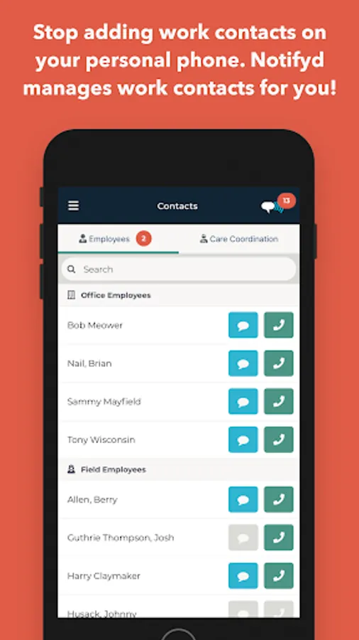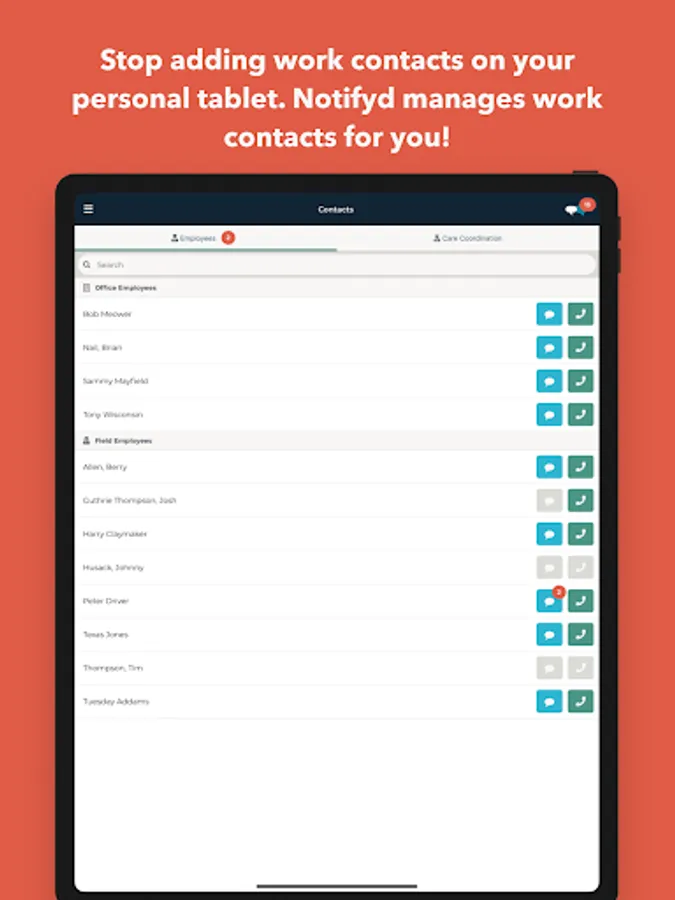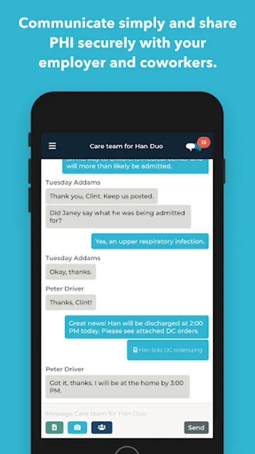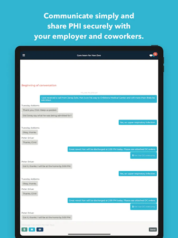 Secure communication for your nurses, schedulers, and back office that feels like texting. Our HIPAA compliant app enables employees to communicate, share documents, and take images and videos right from their phones and desktop.
