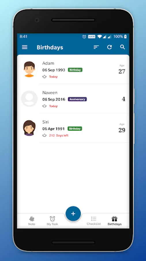 - Notify Me app fetches all the Birthday event stored in phone contact and reminds via notification.