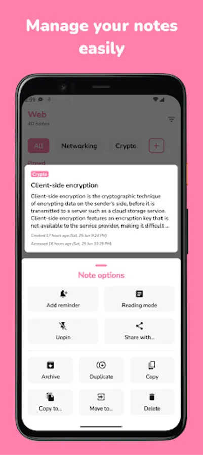 Done with a folder or a note but you don't want to delete them? Just archive it. There is folders archive. In addition to, each folder has its own archive where you can keep your notes just in case you need them at a later time.