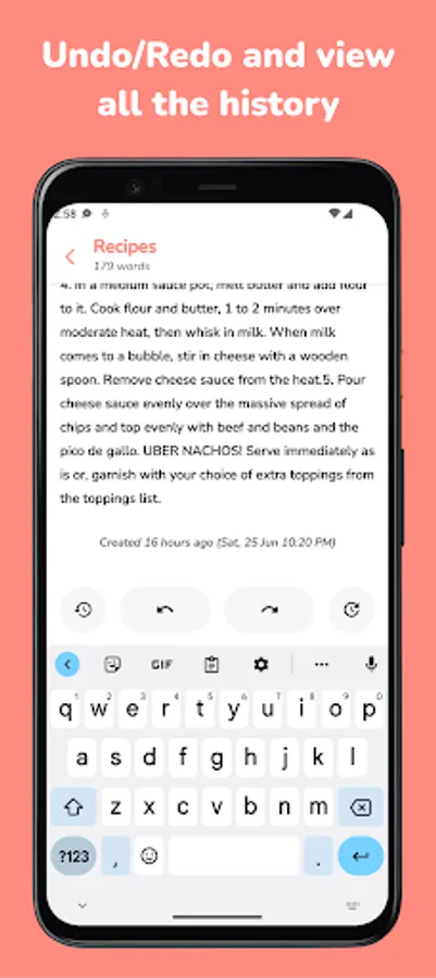 Have you ever typed something but accidentally deleted it? You can easily undo that, or if you wish, you can view the history and jump to any previous version you like. On top of that, Noto supports swiping left or right to undo/redo for faster usage.