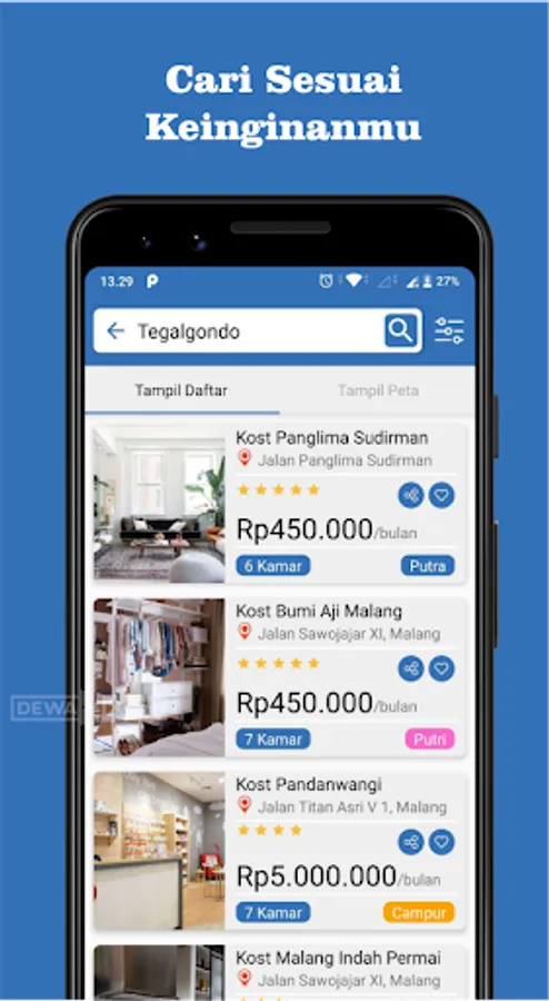 Dewakost presents boarding room information, complete with boarding facilities, boarding prices, and completeness of rooms and photos of rooms in actual conditions. Data Boarding rooms that we have include boarding in Malang. The official version will be released soon (currently in beta) and we are still working on developing data for the board.