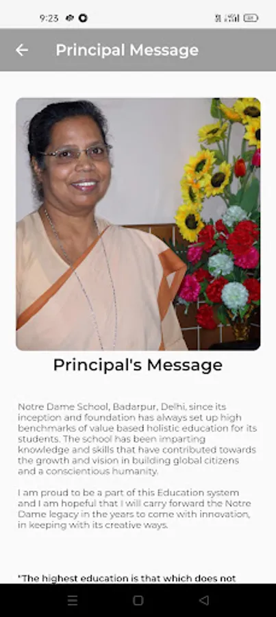 Sister Mary Ranjita is honored as the founding principal of Notre Dame School. During her tenure of ten years as principal, the school developed into a first rate higher Secondary school, preparing students for the CBSE Examinations. The first batch of students appeared for their Secondary examination in 1996 and after the up gradation, the first batch of students appeared for their Senior Secondary examination in 2002.