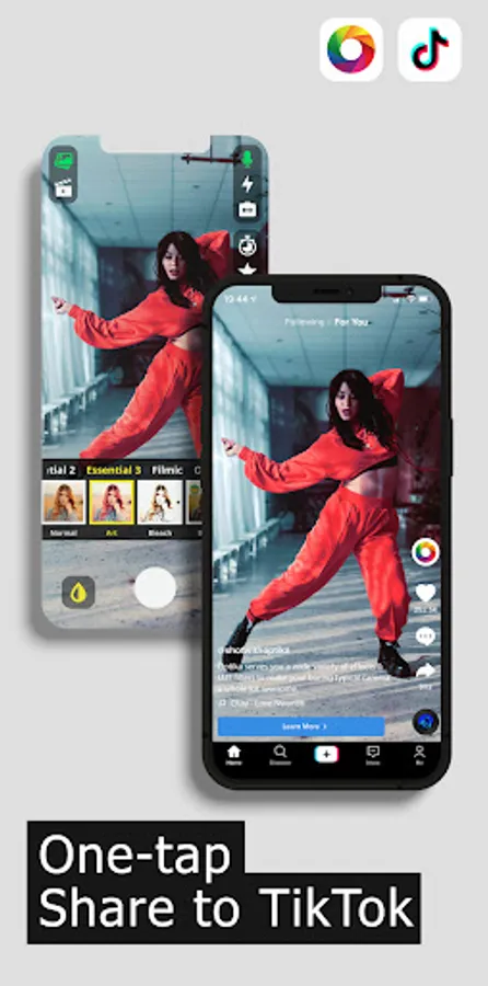 Optika offers two modes, VIDEO MODE (for recording videos) & PHOTO MODE (for taking quick shots) with filters & effects applied to your Camera. Videos recorded using Optika can easily be exported for use on TikTok with a single tap.