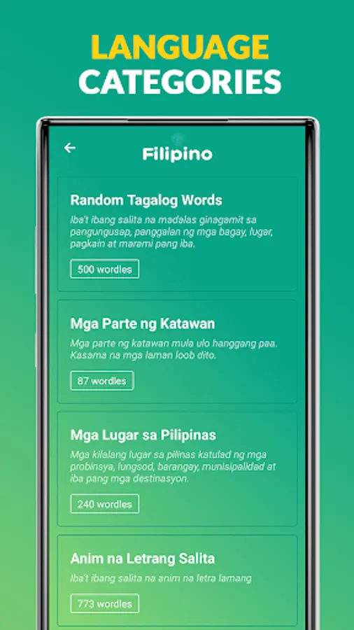 - Word Categories such as 5, 6, 7 letters or even longer words, name of places, random words, name of foods and many more. Download and install the app now and start guessing common filipino words