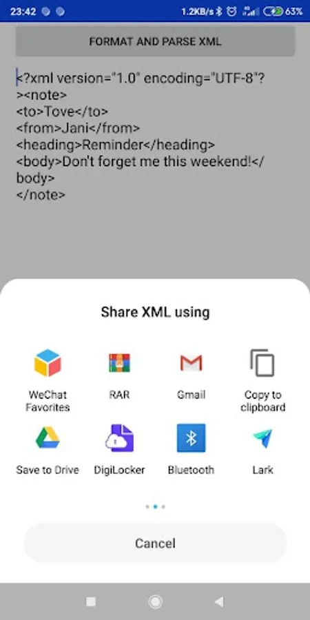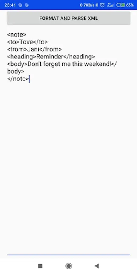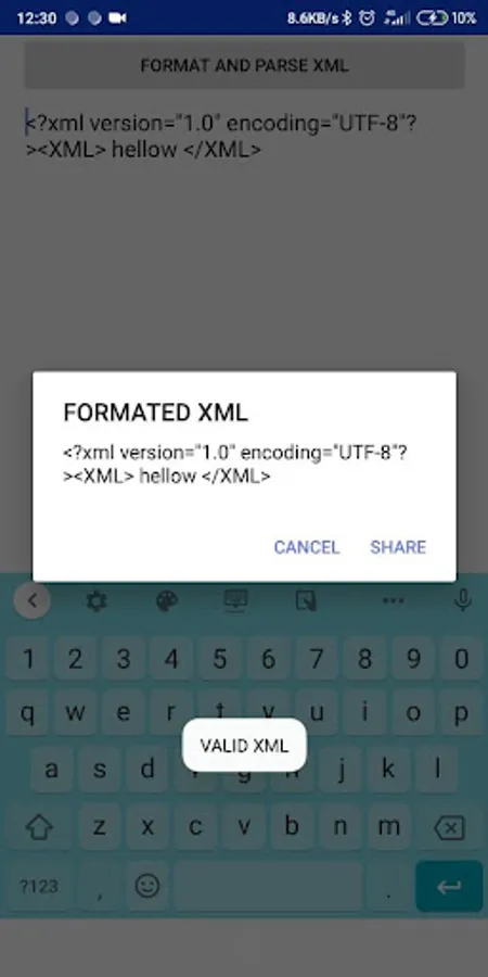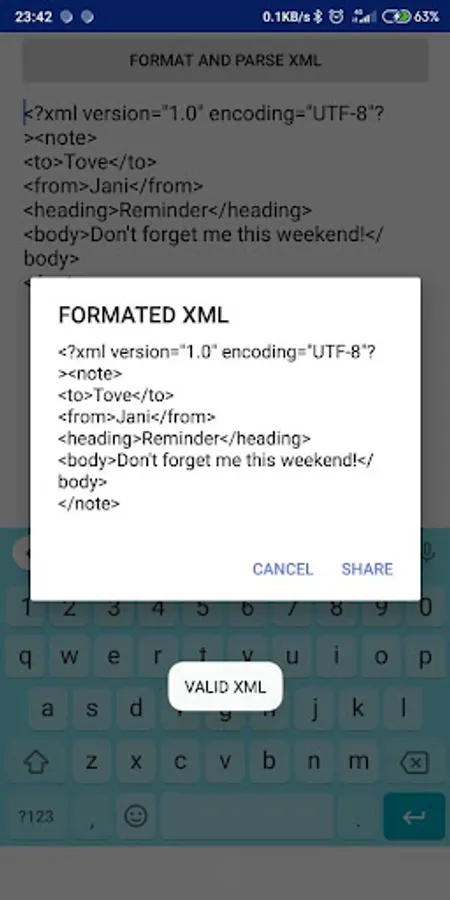 XML Formatter allows you validate and share the XML content ,you can paste the XML and view the formatted XML and share through any other device or server , APP requires no special permissions and data safety is assured