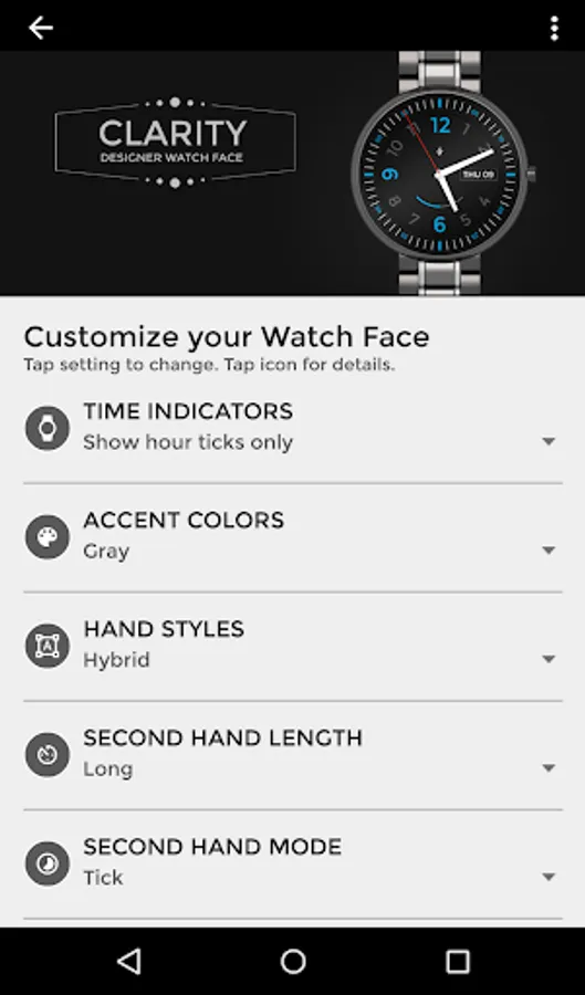 Clarity features the styling of traditional designer watch faces, while remaining immediately usable for a watch's primary purpose:viewing the time. Clarity can be configured to look both classic or contemporary with just a few quick taps.