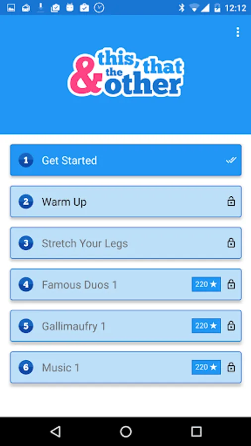 This, That & the Other is a simple trivia game where the answers all come in pairs or triples of words associated with pop culture, trivia, and common word associations. General knowledge, abstract thinking, and word puzzle skills will be required to solve many puzzles that have answers like "Green Eggs & Ham" or "Stop & Drop & Roll."